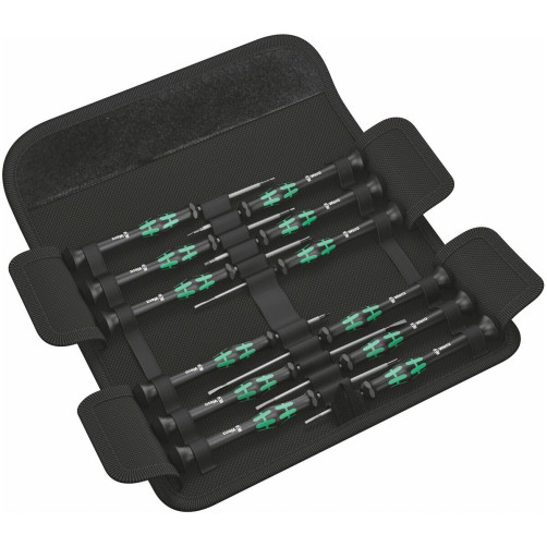 The WERA Electronics screwdriver set offers unmatched precision for delicate work in electronics, IT, and fine mechanics. Each of the 12 tools features an ergonomic handle with a rotating centring cap and a quick-spinning zone, allowing you to apply controlled torque with fingertip precision. Whether you're working on circuit boards or intricate assemblies, this set equips you with slot-head, Phillips, Torx®, and hex profiles, all securely organized in a compact textile tool roll.
